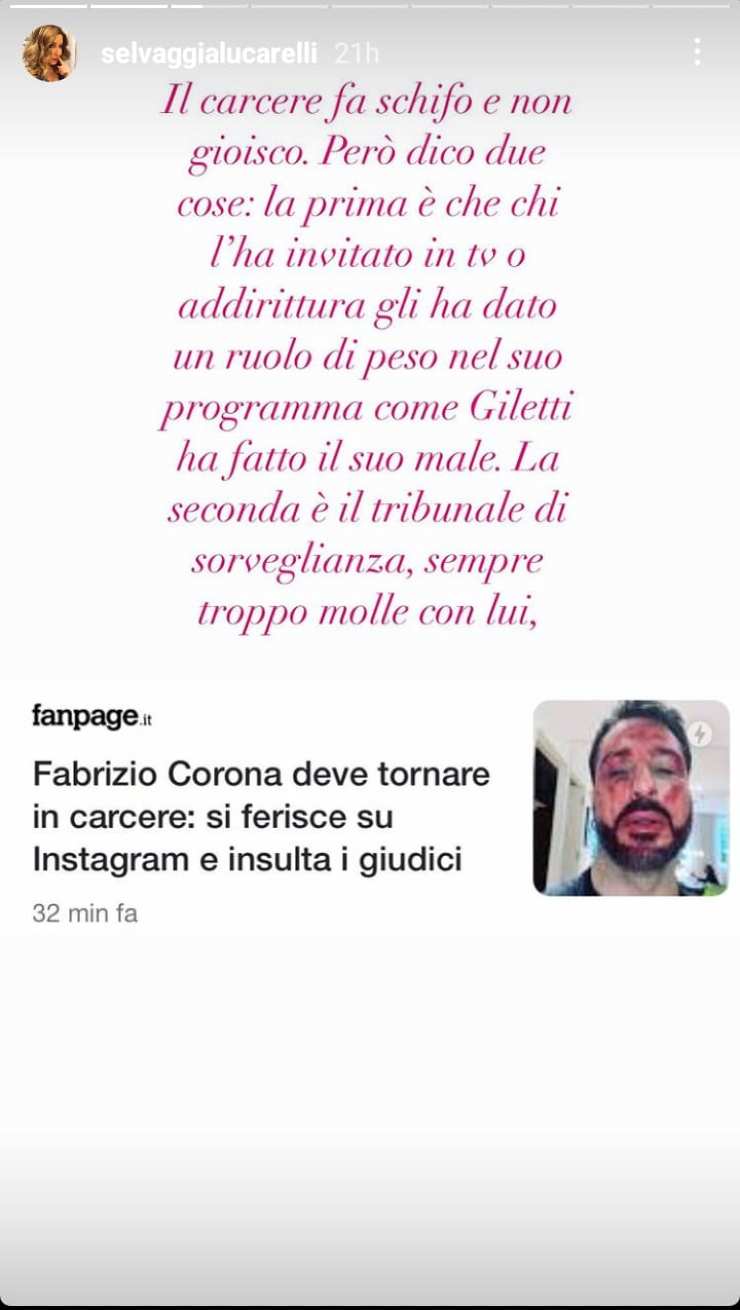 In una stories pubblicata sul suo account Instagram ufficiale, Selvaggia Lucarelli ha scritto: “Il carcere fa schifo e non gioisco. Però dico due cose. La prima è che chi l’ha invitato in tv o addirittura gli ha dato un ruolo di peso nel suo programma come Giletti ha fatto il suo male. La seconda è il Tribunale di Sorveglianza, sempre troppo molle con lui”. Selvaggia Lucarelli si riferisce alle recenti ospitate di Fabrizio Corona a Non è l’Arena, su La7. Negli studi di Massimo Giletti, l’ex re dei paparazzi è intervenuto in varie occasioni, spesso per commentare il Caso Genovese.
