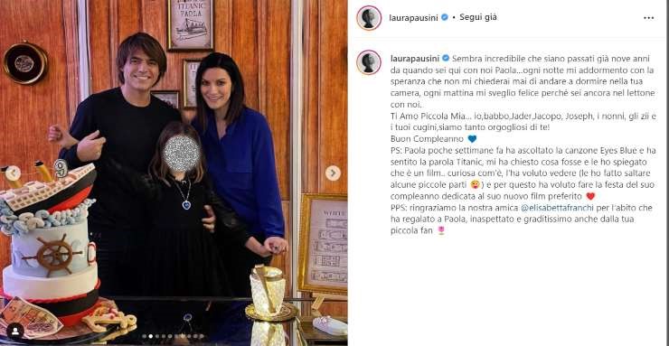 Il post in questione, costellato da varie immagini, inoltre, è seguito anche da una bellissima dedica d’amore scritta da Laura Pausini per la piccola Paola e dove è possibile leggere: “Sembra incredibile che siano passati già nove anni da quando sei qui con noi Paola…ogni notte mi addormento con la speranza che non mi chiederai mai di andare a dormire nella tua camera, ogni mattina mi sveglio felice perché sei ancora nel lettone con noi. Ti Amo Piccola Mia… io, babbo, Jader, Jacopo, Joseph, i nonni, gli zii e i tuoi cugini, siamo tanto orgogliosi di te! Buon Compleanno”.