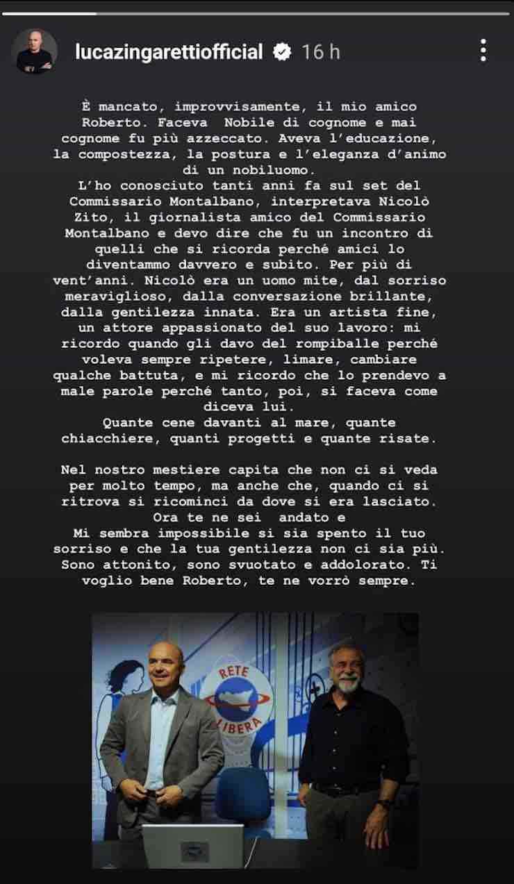 Si tratta del suo carissimo amico e collega Roberto Nobile, l’attore che è improvvisamente scomparso all’età di 74 anni. Luca Zingaretti – che ha condiviso con lui anche le riprese della serie tv Il Commissario Montalbano – ha così voluto ricordarlo sulle sue Instagram stories.